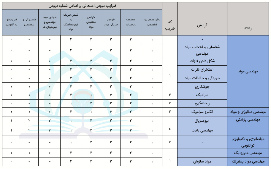 در ادامه توی جدول هم برای آشنایی بیشتر شما دوستان ضریب هر درس تو گرایش های مختلف کنکور ارشد مواد رو گردآوری کردیم.